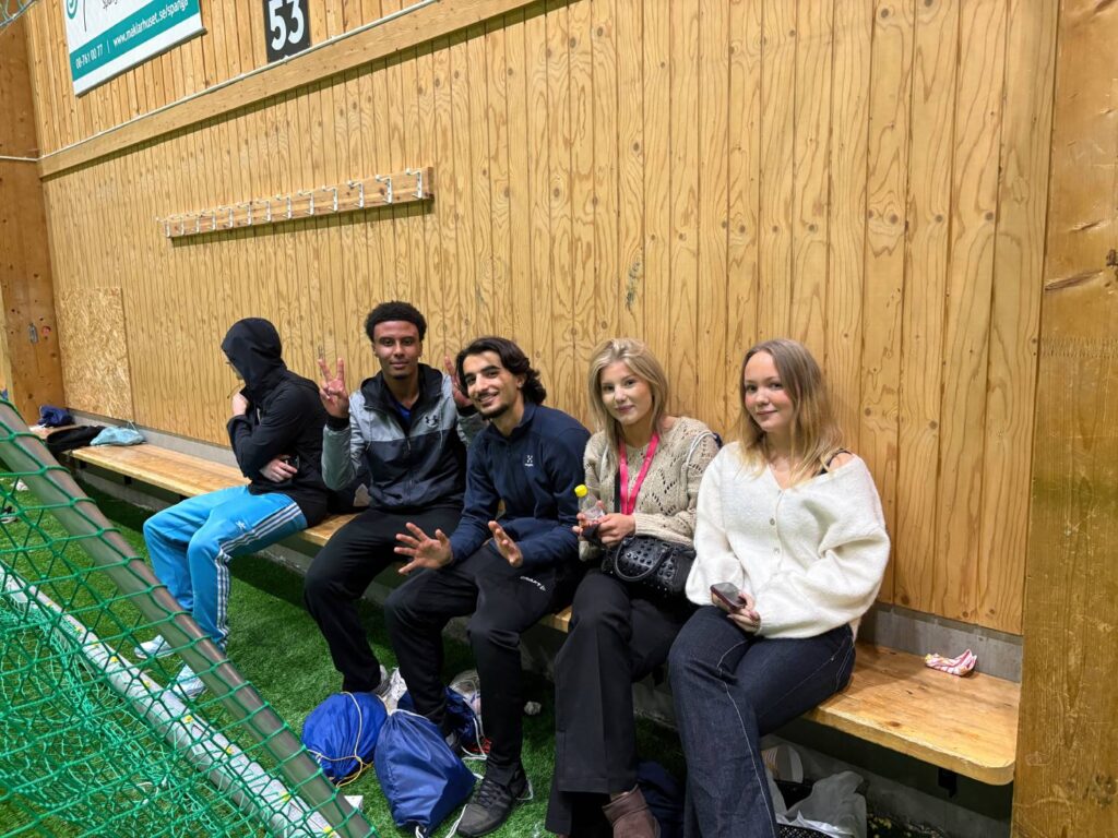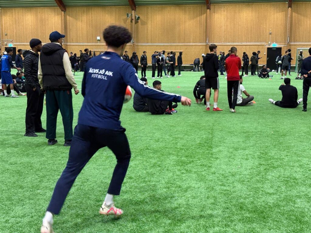Vid kortsidan av hallen där själva tävlingen pågår står många och hejar på sina kompisar som deltar, men runt om i hallen sparkas det också boll flitigt, så det gäller att hålla koll på vad som händer och värja sig så gott det går när man hamnar i skottgluggen.