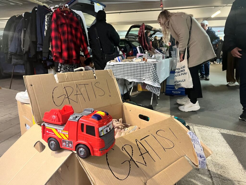 Just idag har kollegorna med gula västar från Loppistajm inte hunnit gå runt så mycket och kan inte säga vilka prylar eller kläder som är mest till buds. De har haft fullt upp med att svara på frågor och agera p-vakter eftersom bilister trotsar skyltarna fastän det står att garaget är avstängt.