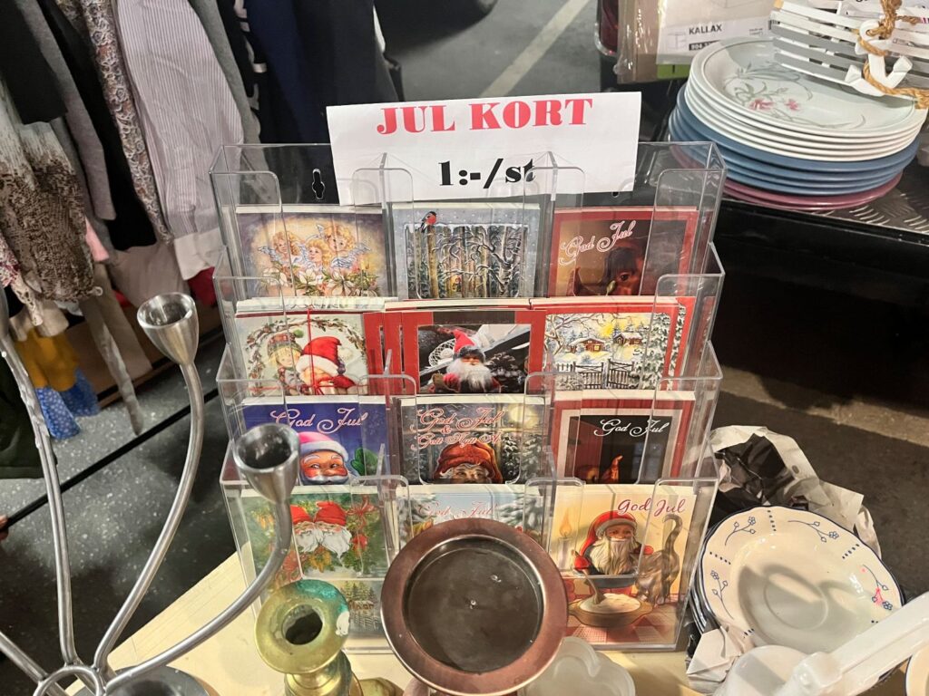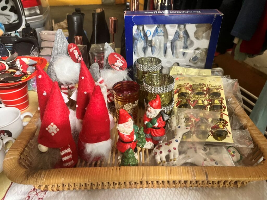 Vid en snabb överblick finns alla möjliga prylar och kläder i de olika stånden: prydnadssaker, hattar, peruker, Pokémon och Digimonkort, skor, smycken, DVD-skivor, leksaker, tavlor och gamla klockor. Och juldekorationer såklart, men en äldre kvinna säger att de går sådär att sälja denna gång, kanske för att löning är först om nio dagar.
