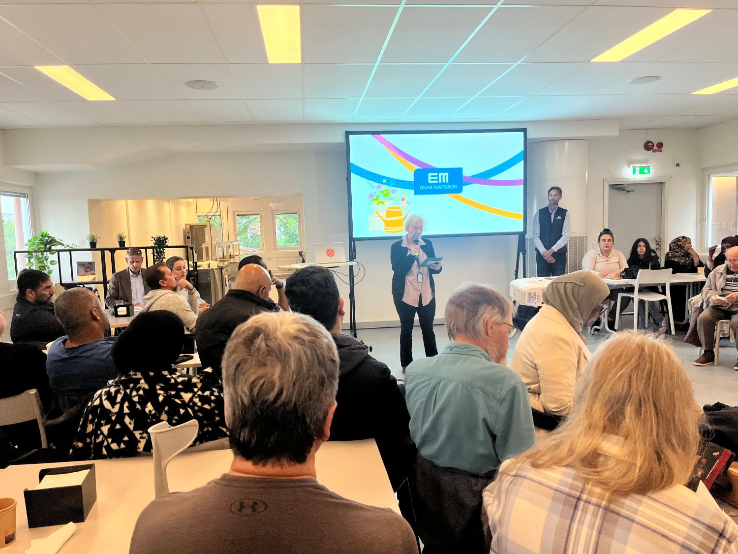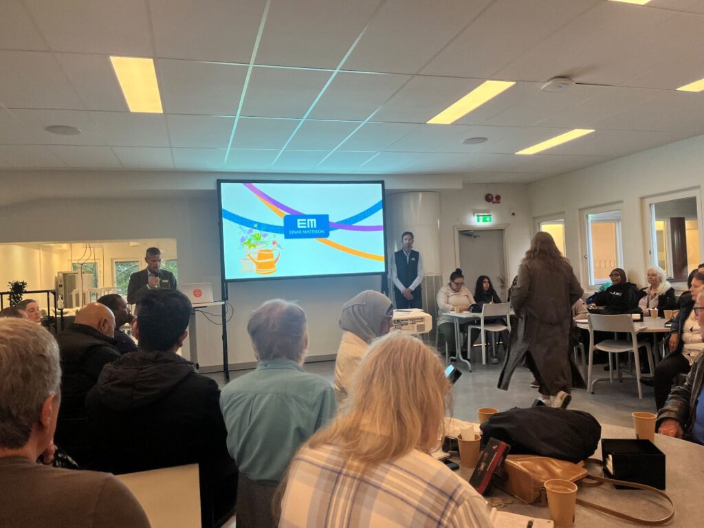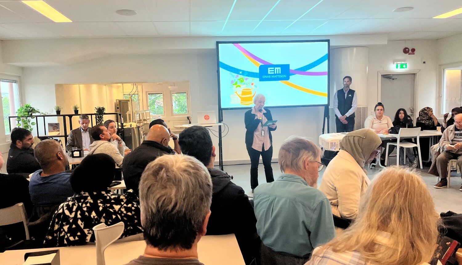 När klockan slagit 17.00 är det fortfarande folk som droppar in och det blir snart så fullt att folk behöver stå upp i gångarna längst bak. Magnus Molin, VD för Einar Mattsson (EM) presenterar kvällen som kommer att bestå av en stunds information och frågor “vid borden”.