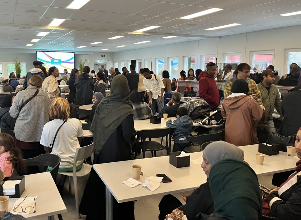 När presentationerna är över utbryter ett stort sorl i lokalen. Tanken är att personalen från de två fastighetsbolagen ska gå runt mellan borden för att svara på frågor, men istället bildas små klungor i gångarna.