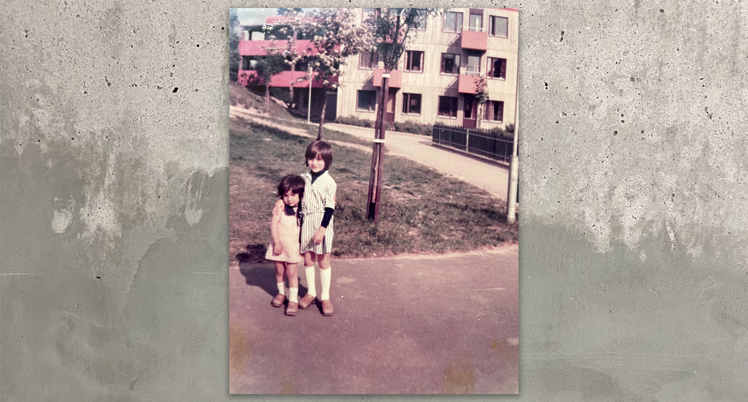 Först bodde vi i ett apelsinfärgat betonghöghus hemma hos faster i tre månader. Husen såg exakt likadana ut och satt ihop så att man inte förstod var ett hem började och var det slutade. Jag hade aldrig sett så många förenade hus förr. Mamma, pappa, Sofia och jag sov i ett avlångt rum med brandgula, blommiga tapeter. Det enda som fick plats i rummet var två smala sängar och vår resväska. Jag sov i mammas famn. Mina två stora kusiner hade ett eget rum närmast ytterdörren och deras mamma och pappa sov i rummet med balkong. Vi var två familjer eller åtta personer i en fyra på 65 kvm. Idag låter det trångt, men då var vi nöjda och glada. Det enda jag minns från tiden hos faster var att maten aldrig riktigt räckte till. De stekte fläskkotletter och pommes frites, men kött fanns inte till alla, så det blev mest potatis för oss barn. Jag brukade drömma om saftiga fläskkotletter kryddade med färsk rosmarin. Grönsaker som var nästan gratis i Grekland var enligt faster en lyxvara här så vi delade någon blek tomat varje helg.