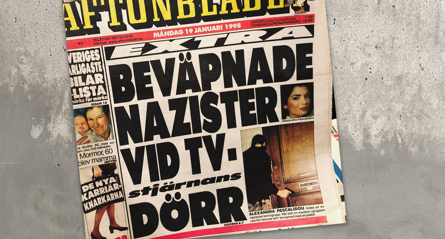 Strax före lunch kom kvällstidningarna. När jag såg Aftonbladets löpsedlar, förstasida och mittuppslag sprang jag in på mitt rum, låste, läste, läste om, läste en gång till. Tårarna vällde okontrollerat fram med sådan kraft att hela min kropp skakade. ”Alexandra Pascalidou hotas av en nazistisk terrorgrupp. Här står en medlem utanför hennes dörr med en skarpladdad pistol.”