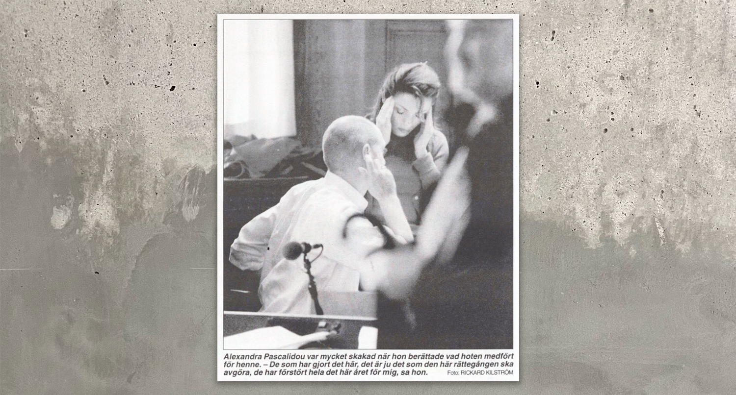 Fem månader efter hotbildernas publicering var det äntligen dags för rättegången i Stockholms tingsrätt. Jag hade aldrig tidigare deltagit i en rättegång. Tillsammans med Claes Cassel, Micke och vår advokat Tomas Rothpfeffer gick jag till tingsrätten. En hord fotografer med bländande kamerablixtar och journalister med vässade pennor mötte oss i entrén.