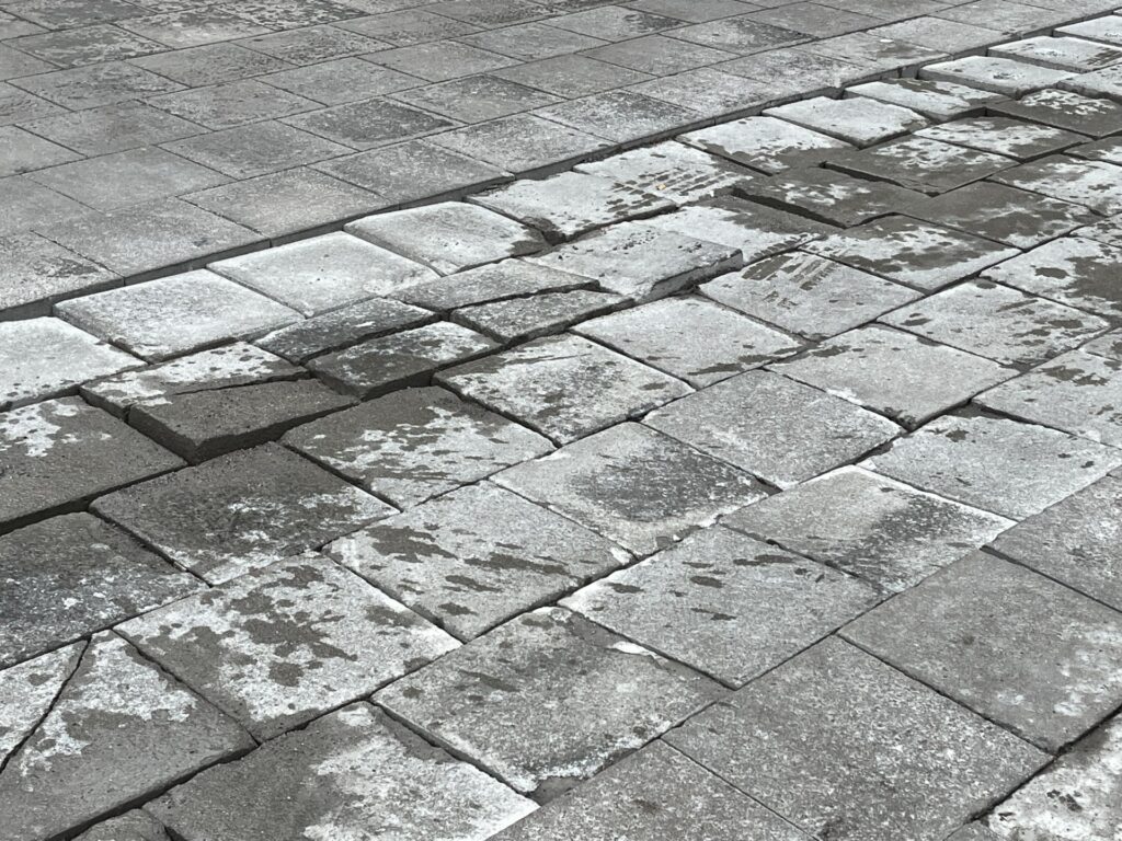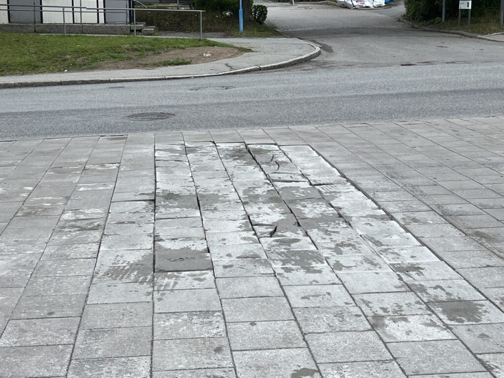 Det är dags att göra det numer årliga vägarbetet vid infarten till Rinkeby centrum. Som vi har rapporterat både i november 2023 och juli 2024 har de betongplattor som lagts ut på sand lossnat från underlaget och spruckit.