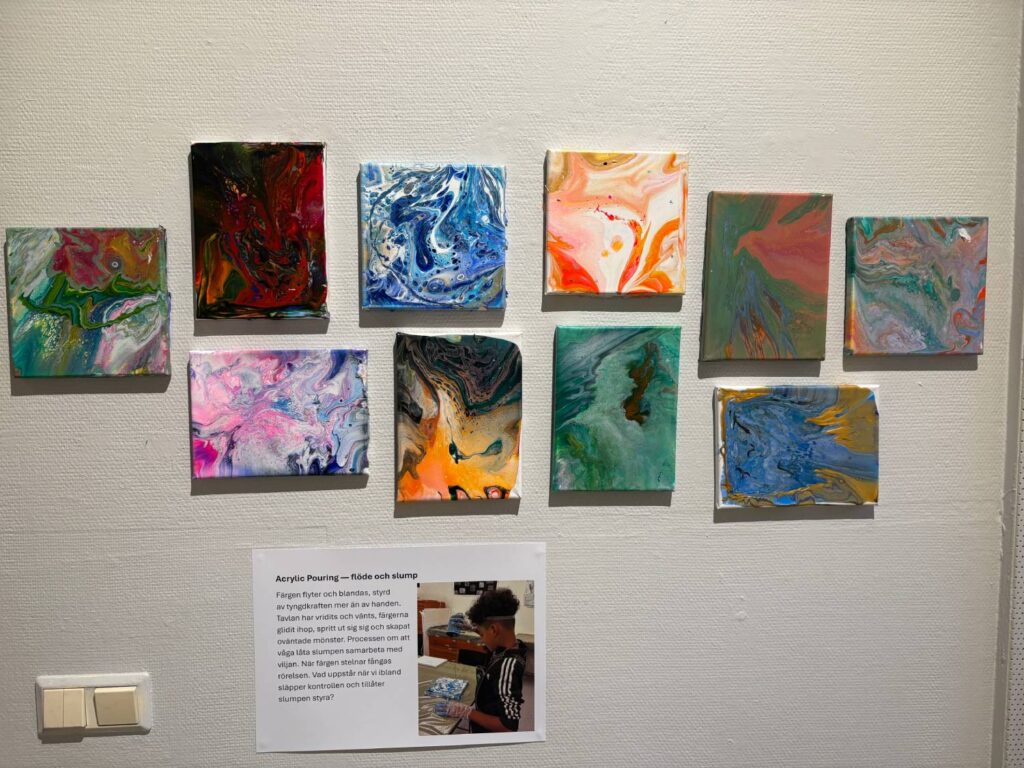 Några av de tekniker som visas är Acrylic pouring, där färgen hälls ut på en målarduk som vänds och vrids så att mönster skapas av slumpen, Ringling där man rullar korvar av lera mellan händerna och fogar dem till en vas och plexiglasmålning, där det blir fina effekter när ljuset faller genom det målade glaset och ger skuggor på väggen bakom.