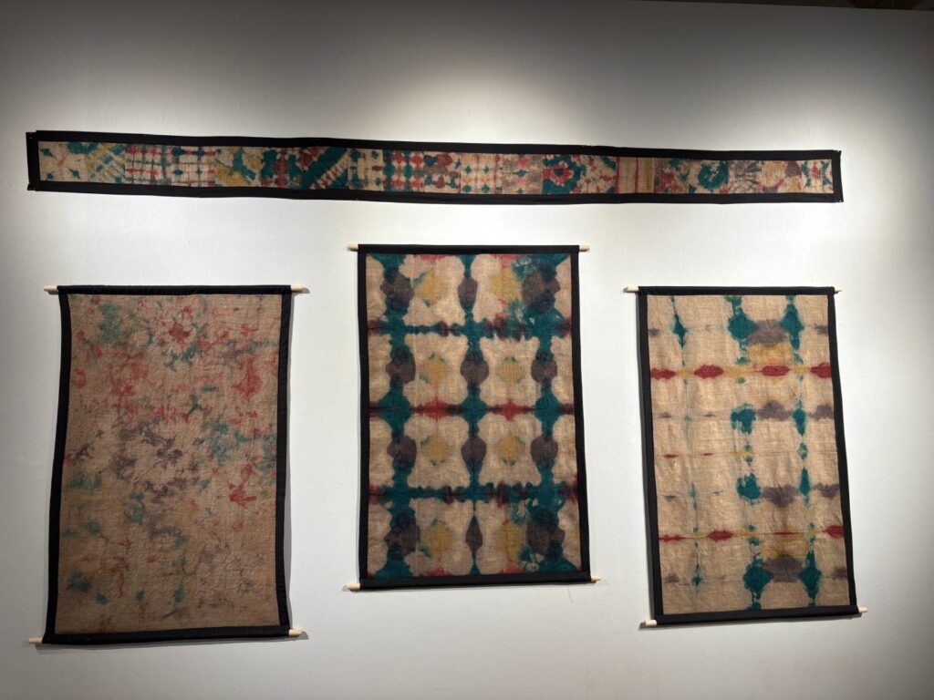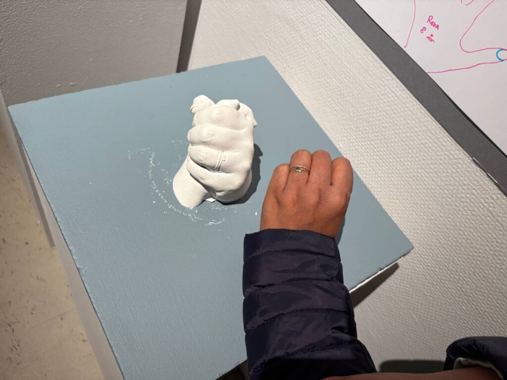 Hon och döttrarna Aaradhya, 12 år, och Reva, 8 år, har kommit till konsthallen för att se sina alster i utställningen. De går runt och flickorna pekar ut vilka tavlor och skulpturer de har gjort. Sujata visar skulpturen av sina händer, där det går att känna igen ringen på hennes hand.