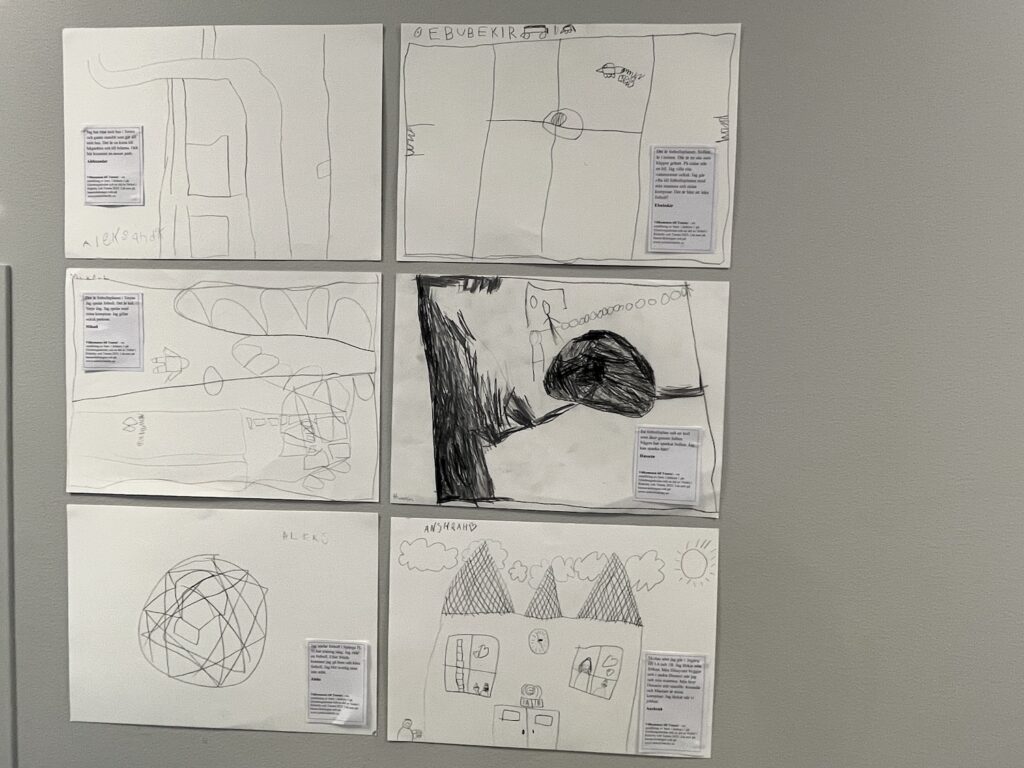 När man kommer in i biblioteket möts man direkt av kartor som barnen har ritat. Man möts också av glada och entusiastiska barn som stolt letar upp sina kartor och visar sina lärare.