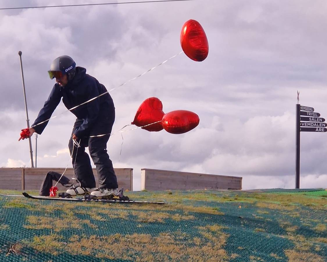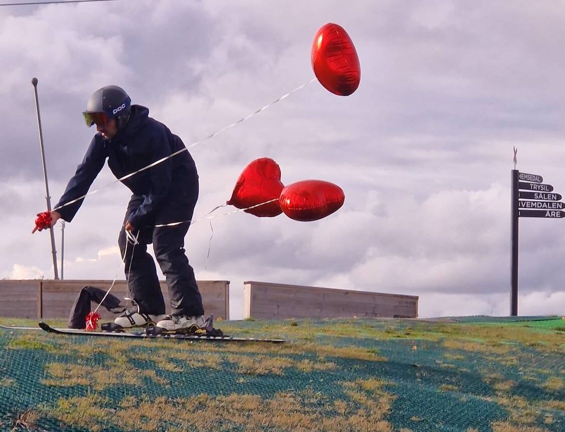 En slalombana brukar markeras med två meter höga käppar av plast. Sådana kan man inte sätta i plast-underlaget så istället markerades banan med hjärt-ballonger. När “de tävlande” tittade ut över backen och såg att det var röda hjärtan de skulle svänga runt så log de. Det gör folk sällan inför start i en slalomtävling.