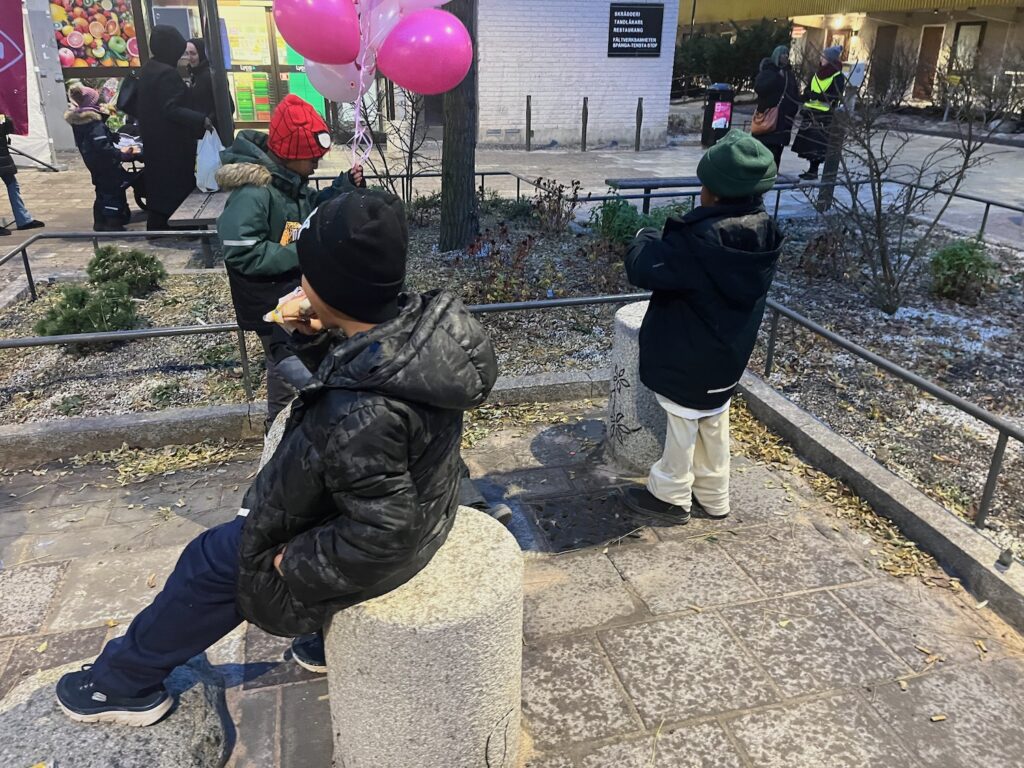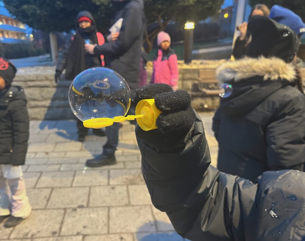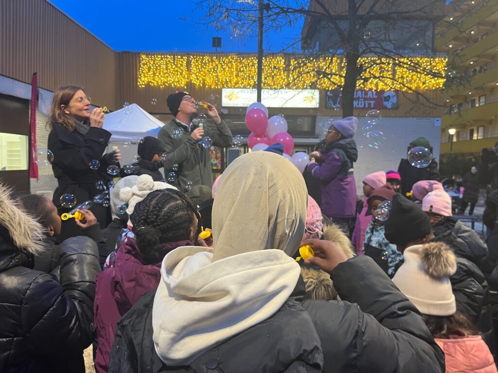 Precis klockan 15 tändes den nya belysningen på torget och barn från förskola och skola i närheten firade med såpbubblor. Barnen hade också varit med och haft önskemål om hur torget skulle utformas.