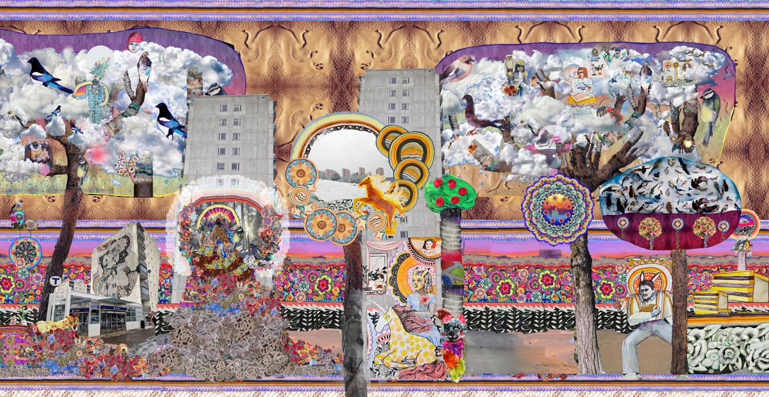 – För mig är förorten en plats rik på kreativitet, kultur och gemenskap. Mitt verk utgår från Husby och dess omgivningar. Byggnader, träd, fåglar och människor rör sig genom bilden och bildar ett collage med en gemensam horisont där olika berättelser kan existera sida vid sida, säger Valeria Montti Colque i pressmeddelandet.