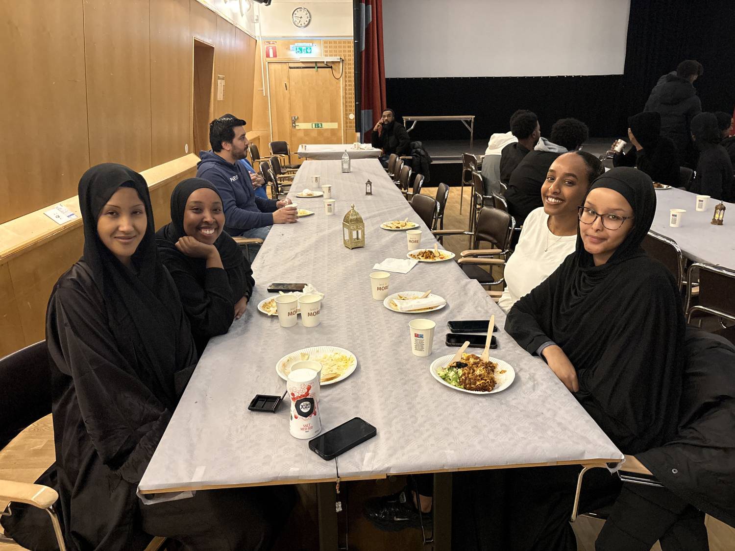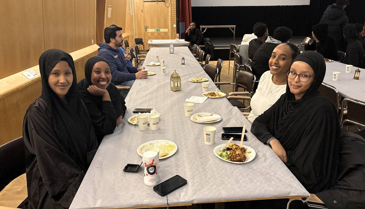 I havet av unga män sitter fyra tjejer och äter. De säger att det är perfekt att det är på lördagen man firar Iftar tillsammans.
