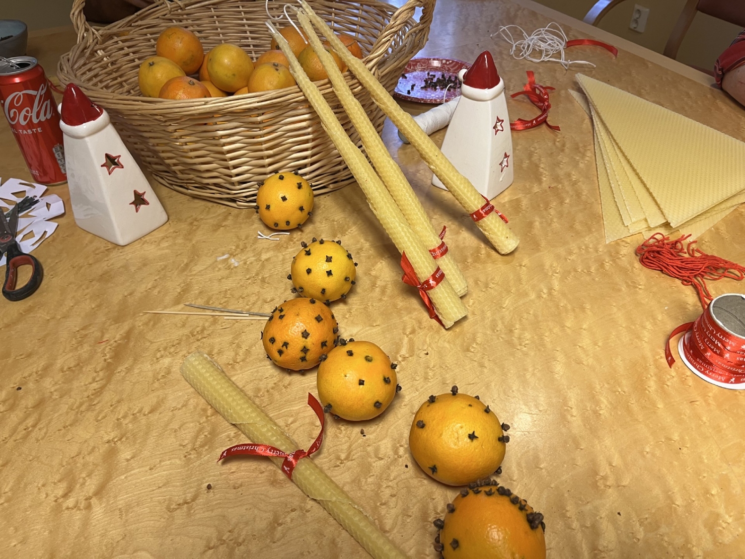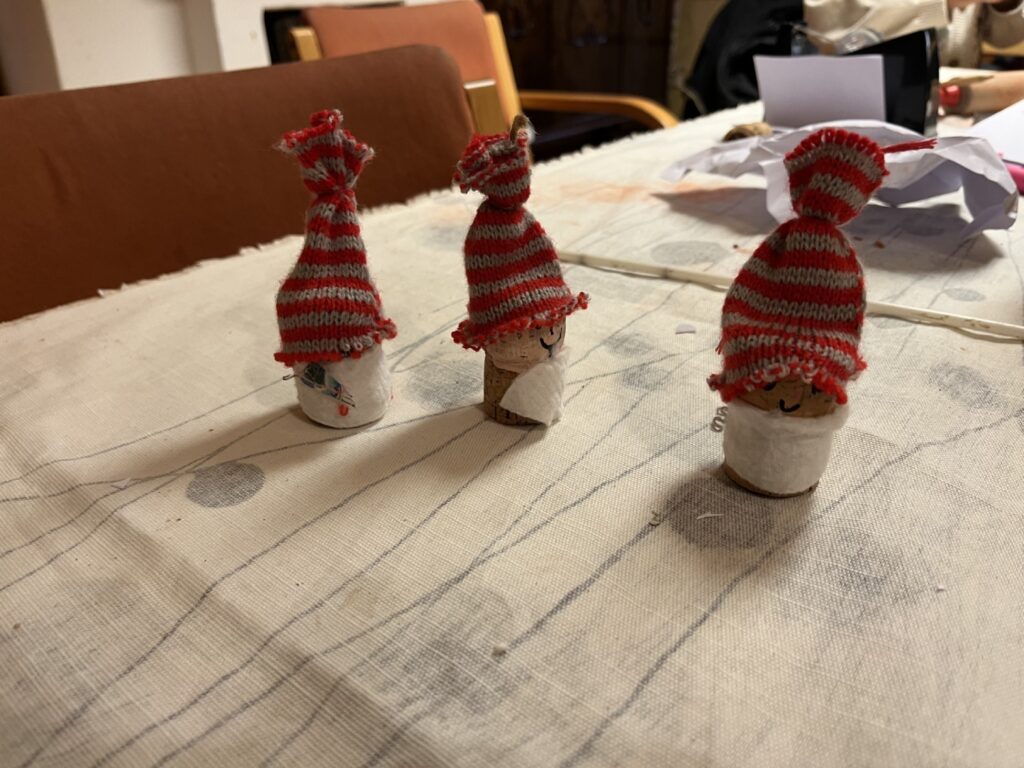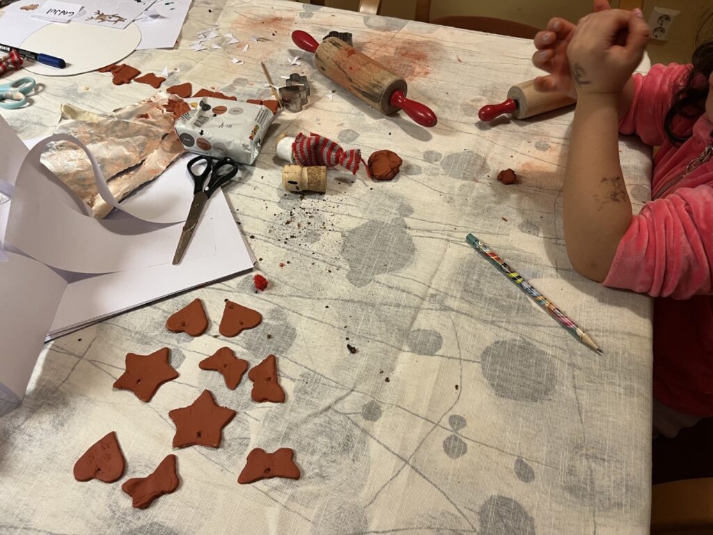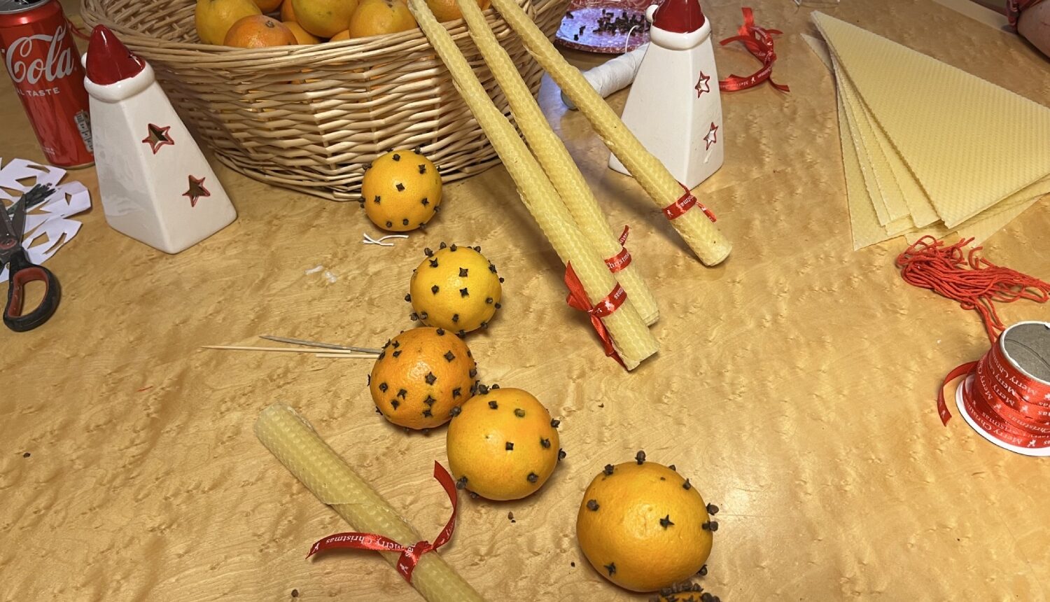 I ett rum fanns ett par bord uppdukade med material att göra sitt eget julpynt med. Det fanns vinkorkar att göra tomtegubbar av, röd lera som kunde kavlas som pepparkaksfigurer och hängas i granen. Apelsiner och en skål med kryddnejlikor och röda band blev traditionellt pynt att hänga på passande plats i hemmet.