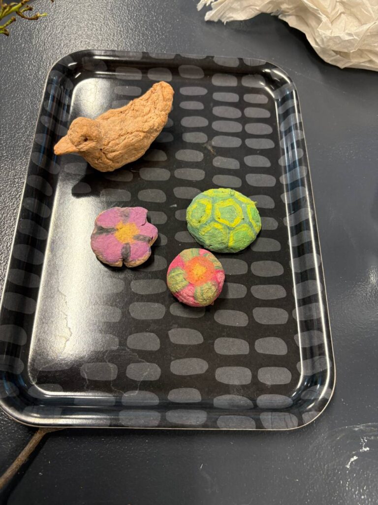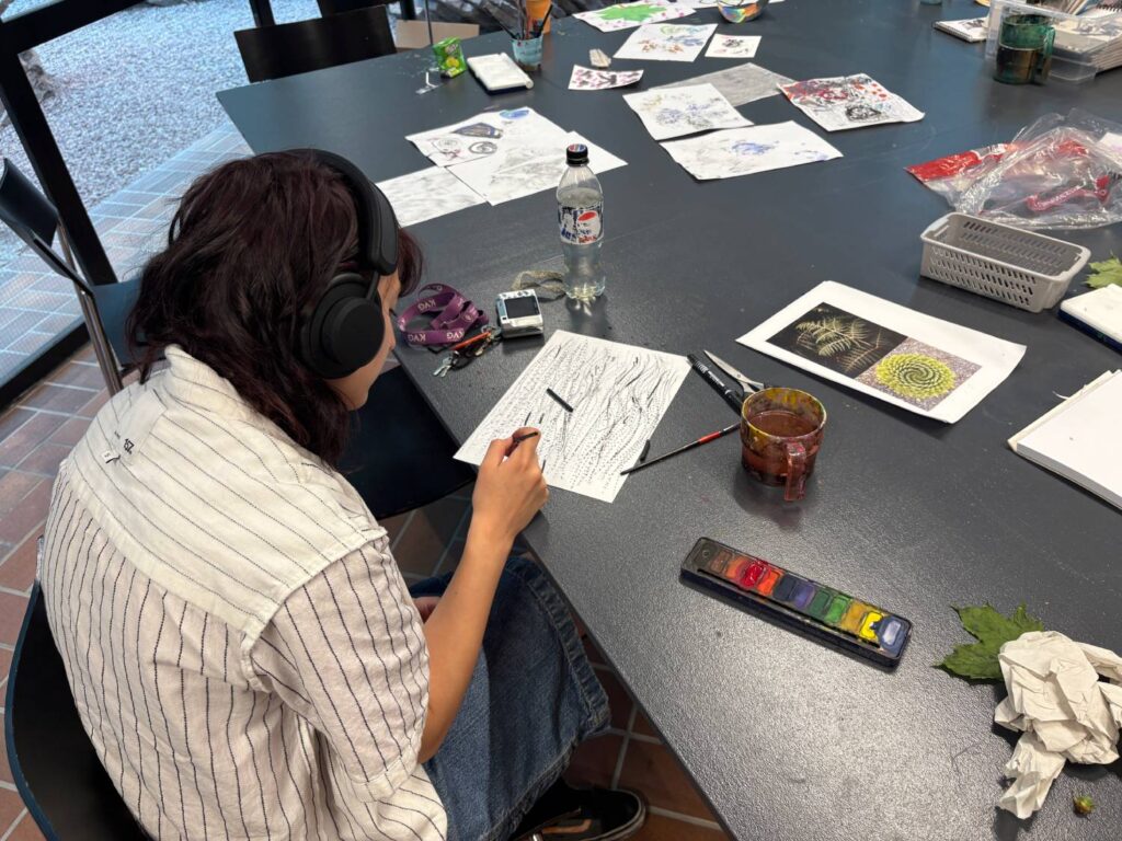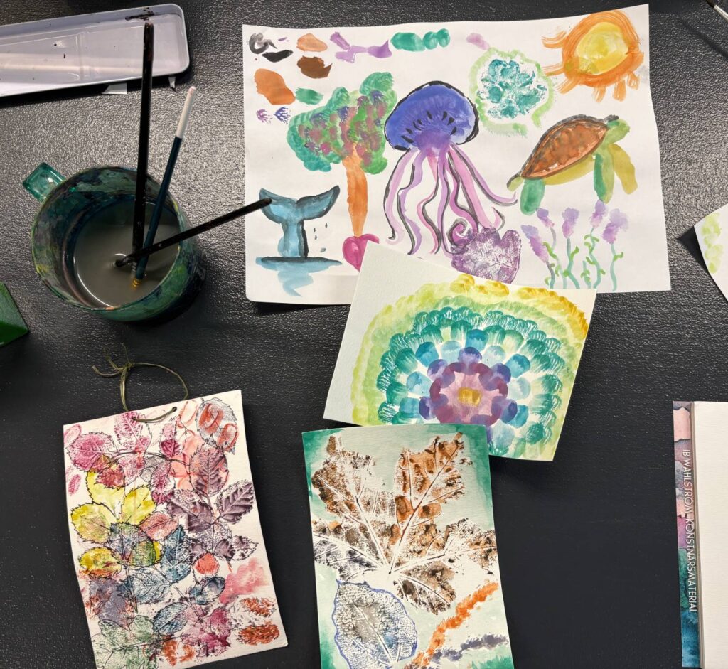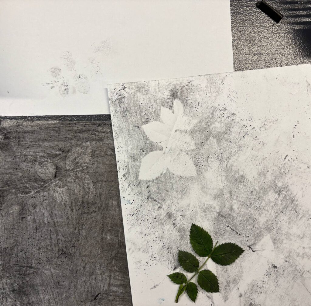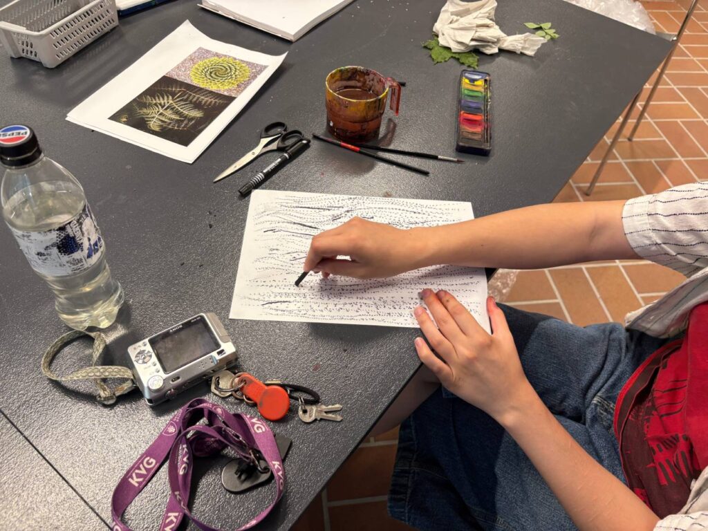 Barnen plockade med sig blad, stenar och pinnar tillbaka, för att utgå från dem i dagens skapande. Gazelle visade barnen olika metoder som man kan använda för att föra över mönstret på ett blad till akvarellpapper eller till ett skisspapper som man har grundmålat med kol. Samma blad kan användas för att skapa helt olika känsla utifrån hur man använder det ihop med kolet på pappret.