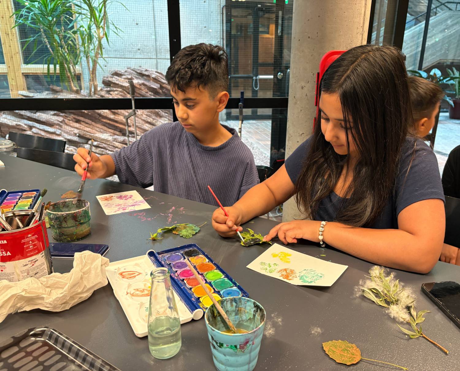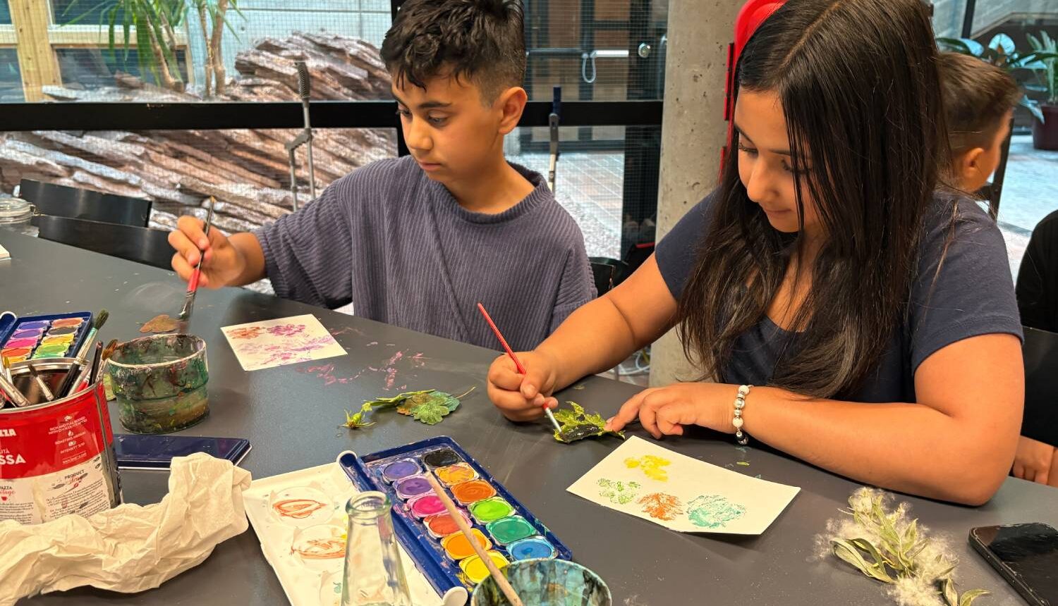 Kusinerna Delissa och Ardin använder blad som de målar på med vattenfärger och sedan trycker mot akvarellpapper. Det skapar tydliga avtryck av bladets ådringar och form.