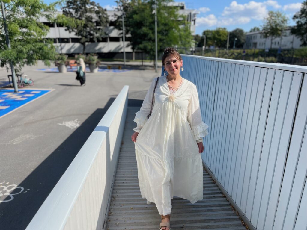 Munas egen klänning är en vit dröm, som skulle kunna vara en brudklänning.
