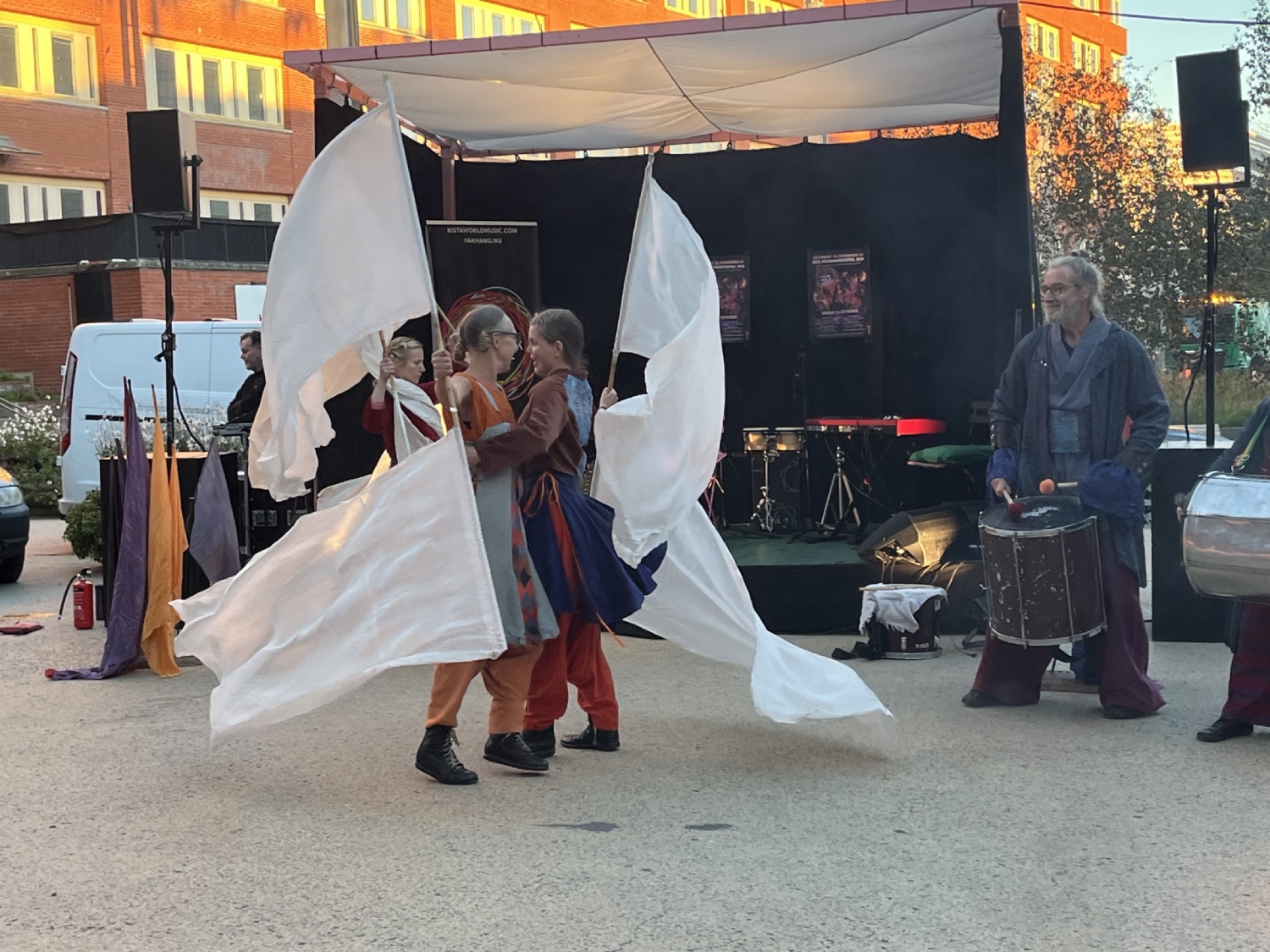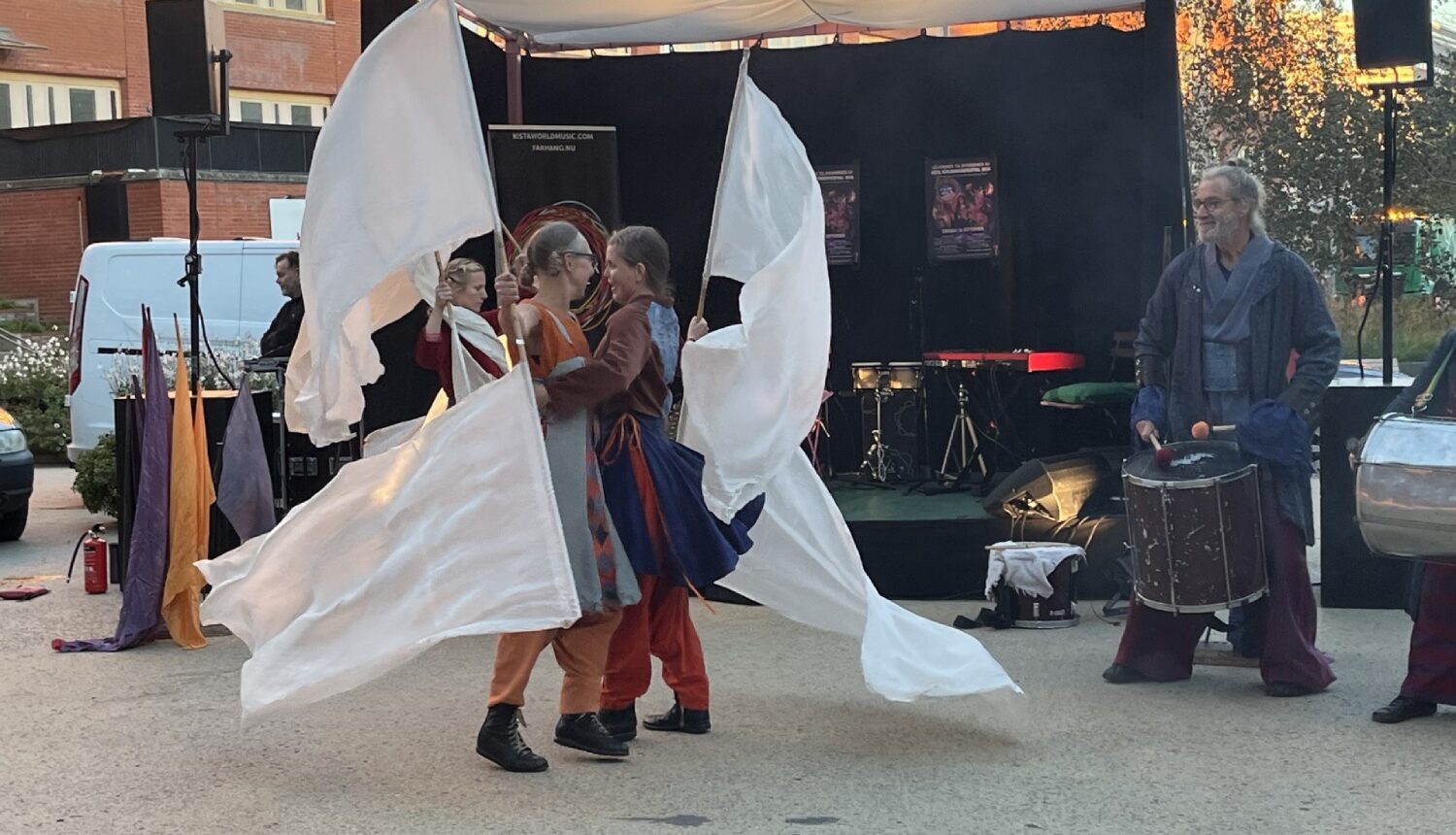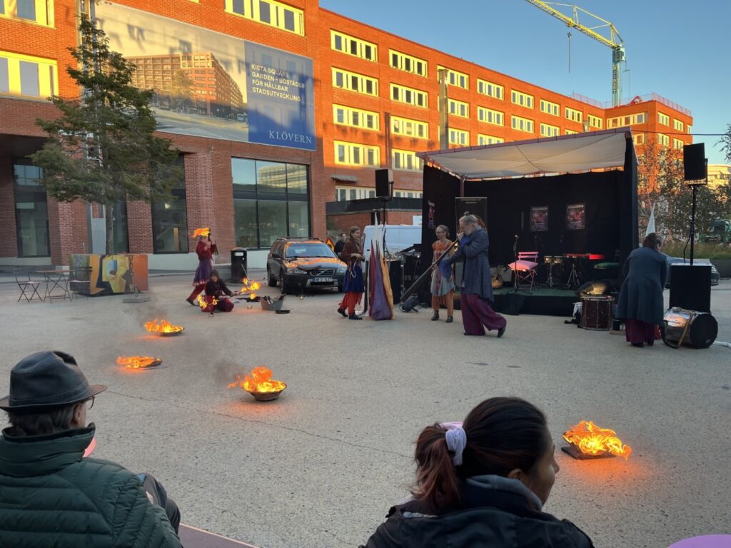 Teater Slàva tog täten med flaggor och trumslag och ledde publiken in i Kista centrum där två dansuppträdanden väntade. Först ut var Del Fuego som består av en klarinettist och en flamencodansare. Mycket inspirerande dans som visar att flamenco kan dansas till annan musik än traditionell, spansk flamenco musik. Nästa gäng upp på dansgolvet var Young Blackout Family. Med medryckande musik och full fart i dansen fick de långa applåder och jubelrop.