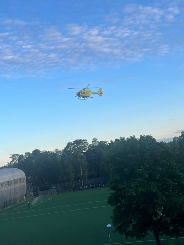 Ambulanshelikopter flög den svårt skadade personen till sjukhus. Tre personer är misstänkta för grov misshandel, men ingen är gripen, enligt Expressen.