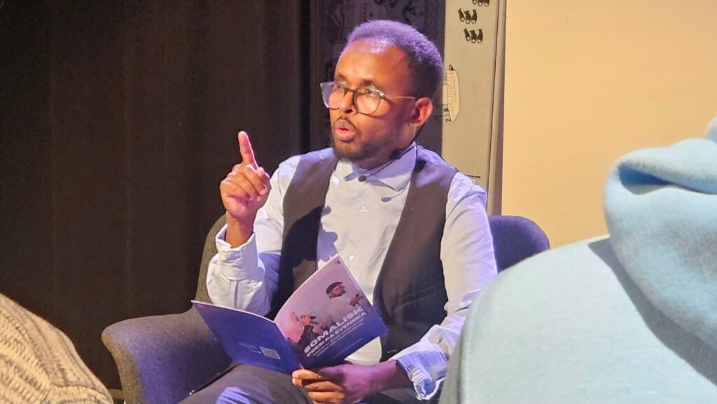 En poesikväll på Tensta bibliotek bjöd på en dikt om osaltad mat med ett djupare budskap. Abdirashid Hirsiguled läste Asha Lul Mohamud Yusufs dikt med översättning av Birgitta Wallin, uppläst av Saba Tadele.