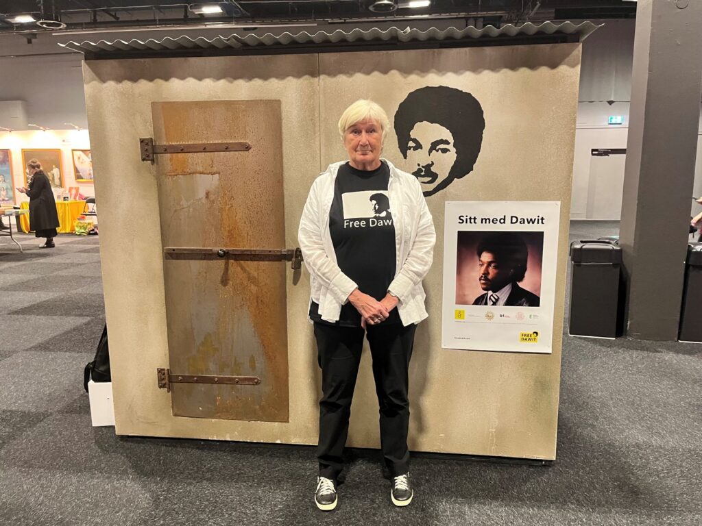 I samma hall, Globala torget, finns skylten “Sitt med Dawit” fäst på en cellprototyp. Där kan den som vill sitta en stund i solidaritet med den oskyldigt fängslade svensk-eritreanske journalisten Dawit Isaak. Elisabeth Löfgren, ordförande för Stödföreningen Free Dawit, berättar att Dawits fru Sofia satt frihetsberövad 28 timmar i samband med upploppen på eritreanska kulturfestivalen 2023. Den 23 september 2025 var det 24 år sedan Dawit Isak fängslades i Eritrea.