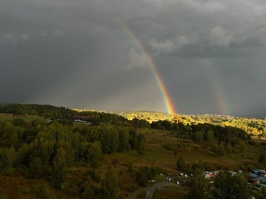 Notis Vackert väderfenomen i början av veckan Igår morse, vid åttatiden på måndagsmorgonen, var himlen nästan svart. Och plötsligt regnade det häftigt, samtidigt som solen sken. Då tog Hanin Salah de här bilderna på regnbågen över Järva. 27 september, 2022