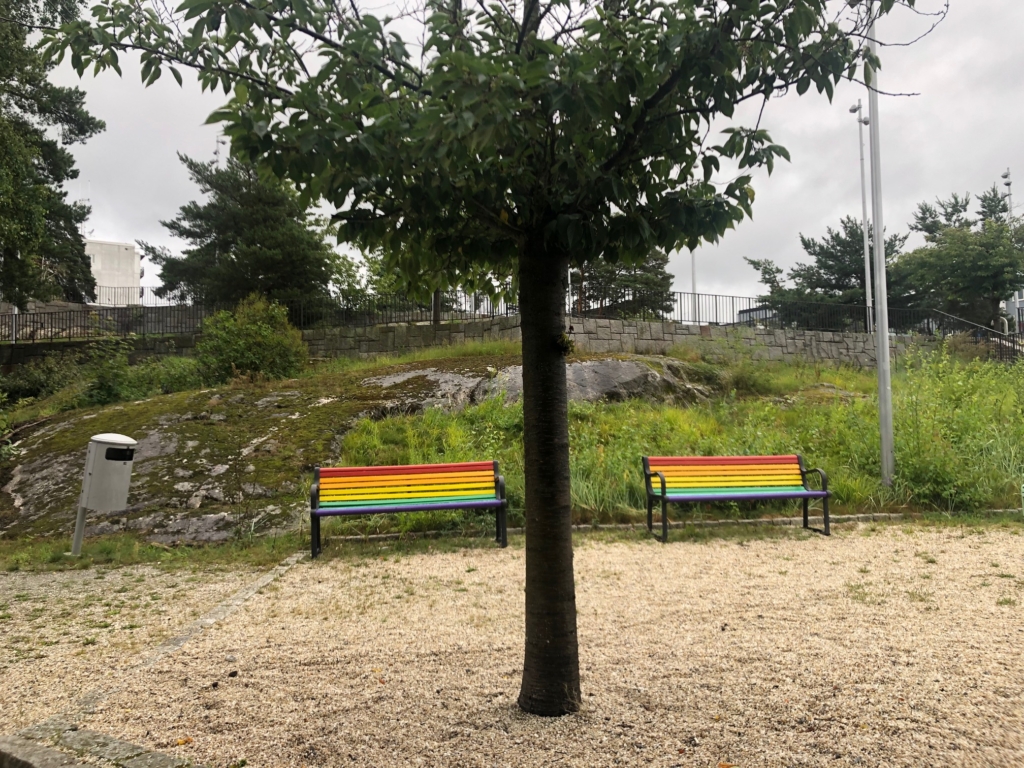 Utanför moskéns finns redan tidigare flera parkbänkar att sitta på, men ändå placerades två Pride-bänkar precis där.